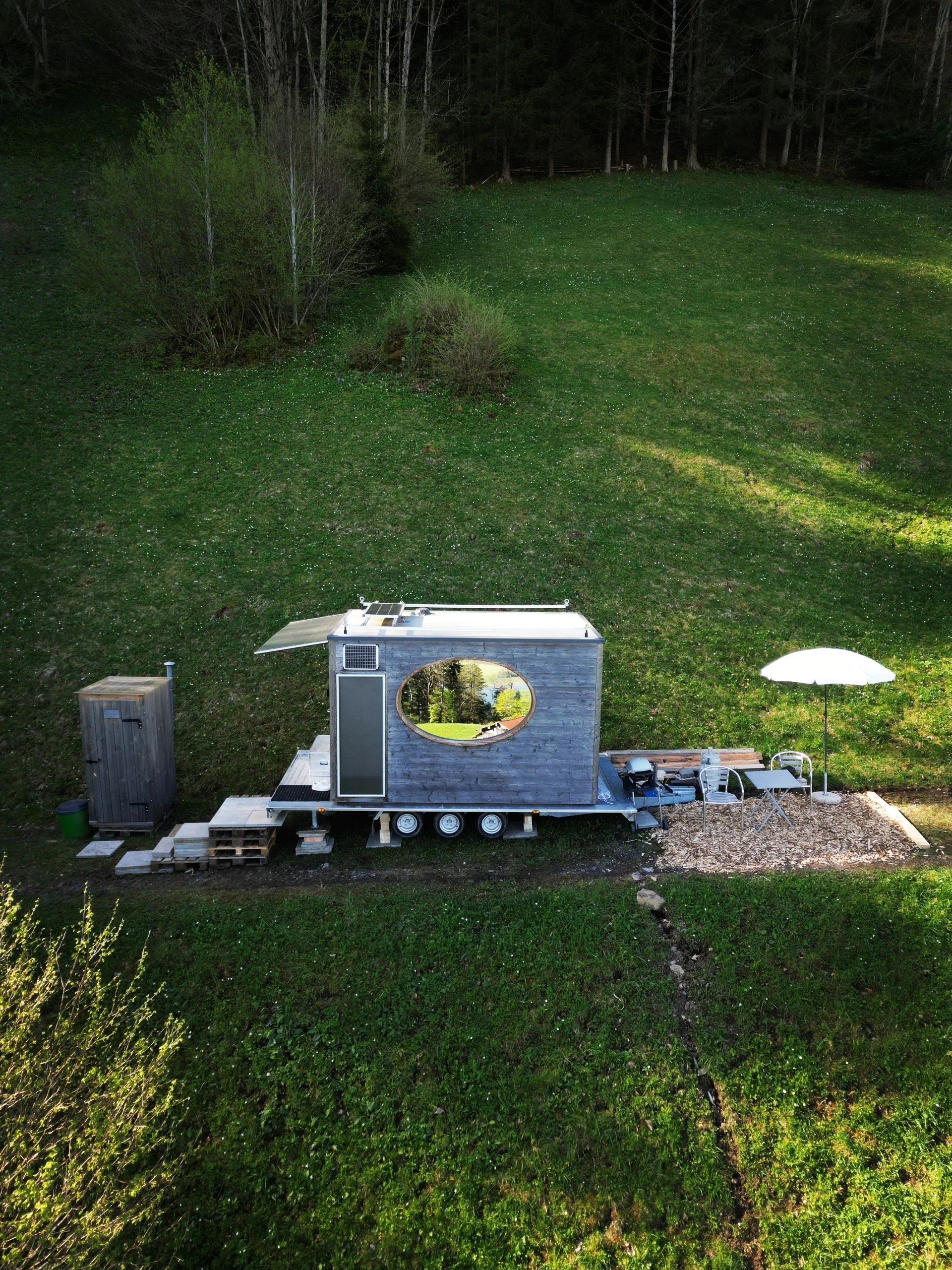 Übernachte im Tiny House aus Mondholz, welches alleine auf einer Wiese, umgeben von Bäumen steht.